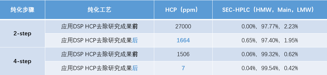 无论采用2步层析工艺抑或4步层析工艺,应用DSP关于HCP去除的研究成果后,此项目产品中的HCP残留均大幅下降,SEC纯度保持不变。有效清除了工艺残留杂质(HCP 低于10ppm;对比已上市同类别产品的900ppm有显著下降)。
